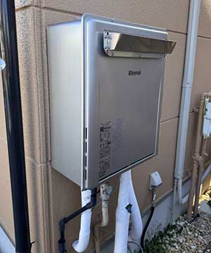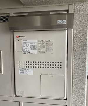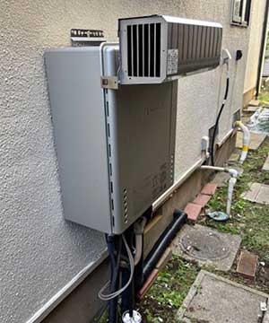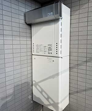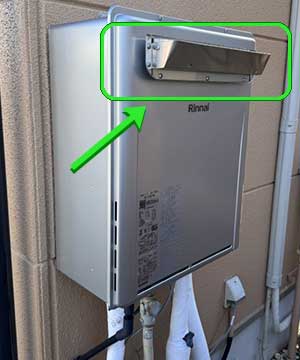 この写真ではわかりませんが、給湯器の正面にすぐ隣家の敷地などがあるため上方排気カバーを取付けています。